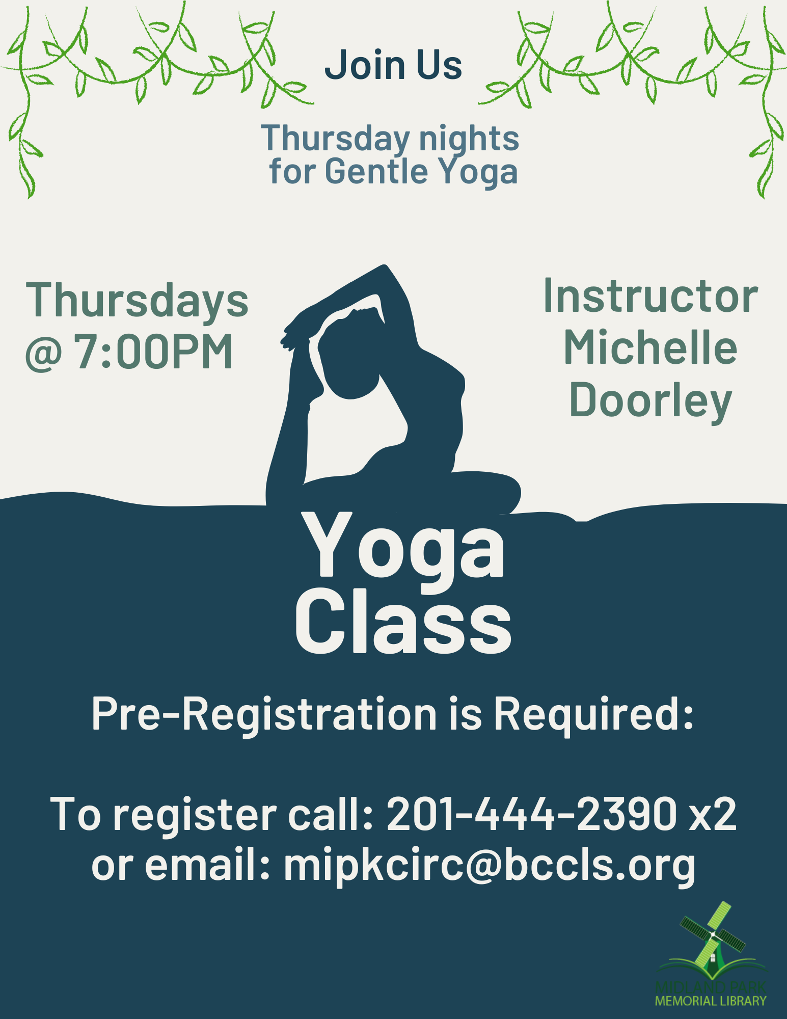 The class will be held in the community room. $10 donation per class is suggested to be given to the instructor. Register by calling 201-444-2390 or emailing mipkcirc@bccls.org. Please click more information to view class flyer.