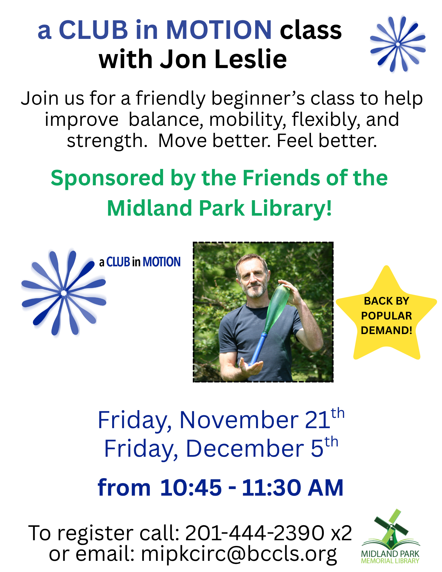 A Club in Motion with Jon Leslie Friday, November 21, 2025 10:45 AM 11:30 AM 10:45 11:30 Midland Park Memorial Library 250 Godwin Avenue Midland Park, NJ, 07432 United States (map) Google Calendar ICS