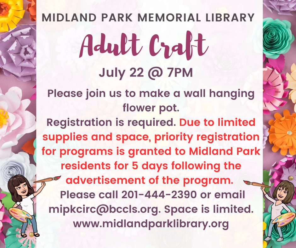All the supplies for this craft will be provided. Quantities are limited. Must call 201-444-2390 or email mipkcirc@bccls.org to register for this event.